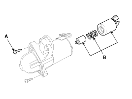 Отсоедините кабель стартера (А) от клеммы В соленоида, затем отсоедините разъем от клеммы S (В).