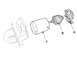 Снимите узел щеткодержателя (А), узел якоря (В) и узел бугеля (С).