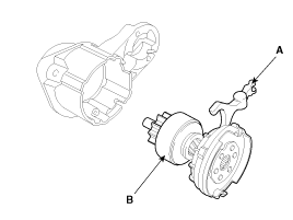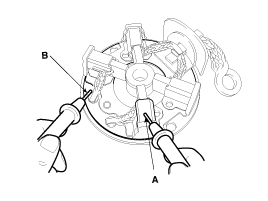 Убедитесь в отсутствии непрерывности между (+) щеткодержателем (A) и (-) пластина (B). Если есть непрерывность, замените щеткодержатель сборка.