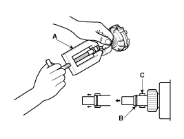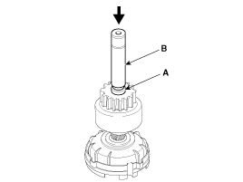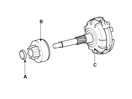 Отсоедините стопор (А), обгонную муфту (В) и внутреннюю шестерню (С).