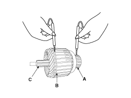 С помощью омметра проверьте отсутствие непрерывности между коммутатором (А) и сердечником катушки якоря (В), а между коммутатором и вал якоря (С). При наличии непрерывности замените якорь.