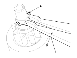 После снятия стопорного кольца (A) с помощью плоскогубцев (B).