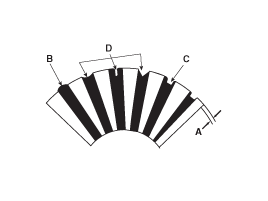 Проверьте глубину слюды (A). Если слюды слишком много (B), подрежьте слюду ножовкой на нужную глубину. Отрезать все слюда (C) между сегментами коммутатора. Подрез не должен быть слишком мелкой, слишком узкой или V-образной (D).