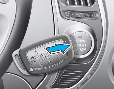 Если батарея смарт-ключа разряжена или смарт-ключ работает неправильно, Вы можете запустить двигатель, нажав кнопку запуска/остановки двигателя с умным в направлении, указанном на картинке выше.
