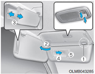 Чтобы воспользоваться косметическим зеркалом, опустите солнцезащитный козырек и сдвиньте крышку зеркала (4).