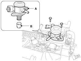 Снимите топливный насос высокого давления (А) и роликовый толкатель (В).
