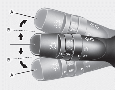 Чтобы подать сигнал поворота, переместите рычаг вверх для поворота направо или вниз для поворота налево. в положение (А). Рычаг вернется в положение ВЫКЛ после завершения поворота.