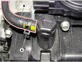 Отсоедините шланг сапуна (В) от крышки корпуса клапана.