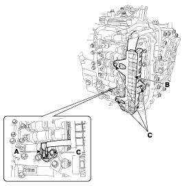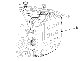 Отсоедините разъем электромагнитного клапана (В) и датчик температуры масла (А) от корпуса клапана.