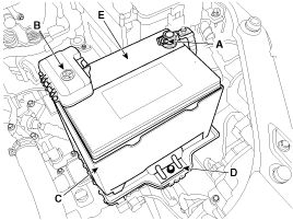 Снимите монтажный кронштейн аккумулятора (D) и изоляционную прокладку (C), а затем снимите аккумулятор (E).