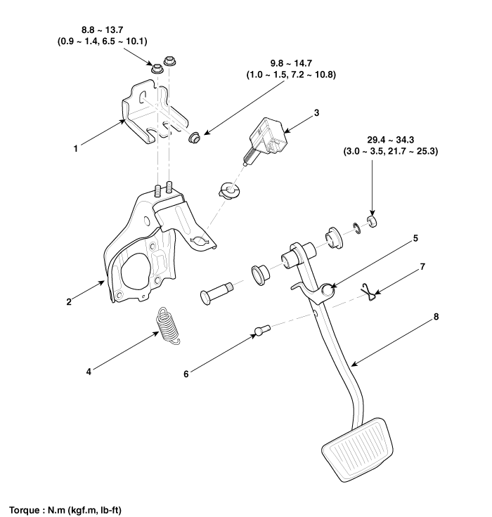 2. Педаль тормоза в сборе 3. Выключатель стоп-сигнала 4. Возвратная пружина |