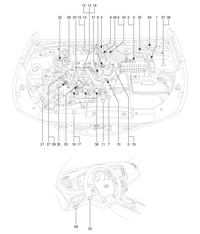 22. Датчик давления в топливном баке (FTPS) 23. Датчик уровня топлива (ДУТ) 24. Двигатель ETC [интегрирован в модуль ETC] 25. Инжектор 26. Электромагнитный клапан управления продувкой (PCSV) 27. Масляный регулирующий клапан CVVT (OCV) [ряд 1/впуск] 28. Масляный регулирующий клапан CVVT (OCV) [ряд 1/выхлоп] 29. Масляный регулирующий клапан CVVT (OCV) [ряд 2/впуск] 30. Масляный регулирующий клапан CVVT (OCV) [ряд 2 / выпуск] 31. Электромагнитный клапан регулируемого впуска (VIS) №1 32. Электромагнитный клапан регулируемого впуска (VIS) №2 33. Клапан контроля давления топлива (FPCV) 34. Клапан закрытия канистры (CCV) 35. Коробка привода форсунки (IDB) 36. Катушка зажигания 37. Главное реле 38. Реле топливного насоса 39. Разъем канала передачи данных (DLC) [16-контактный] 40. Многоцелевой контрольный разъем [20 контактов] |