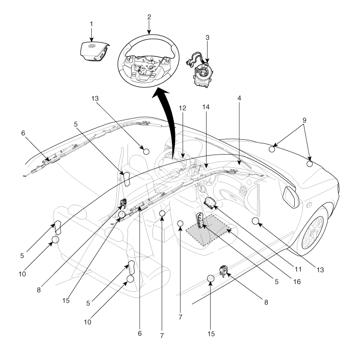 2. Рулевое колесо 3. Часовая пружина 4. Подушка безопасности пассажира (PAB) 5. Боковая подушка безопасности (SAB) 6. Шторка безопасности (CAB) 7. Выключатель пряжки ремня безопасности (BS) 8. Преднатяжитель ремня безопасности (BPT) |