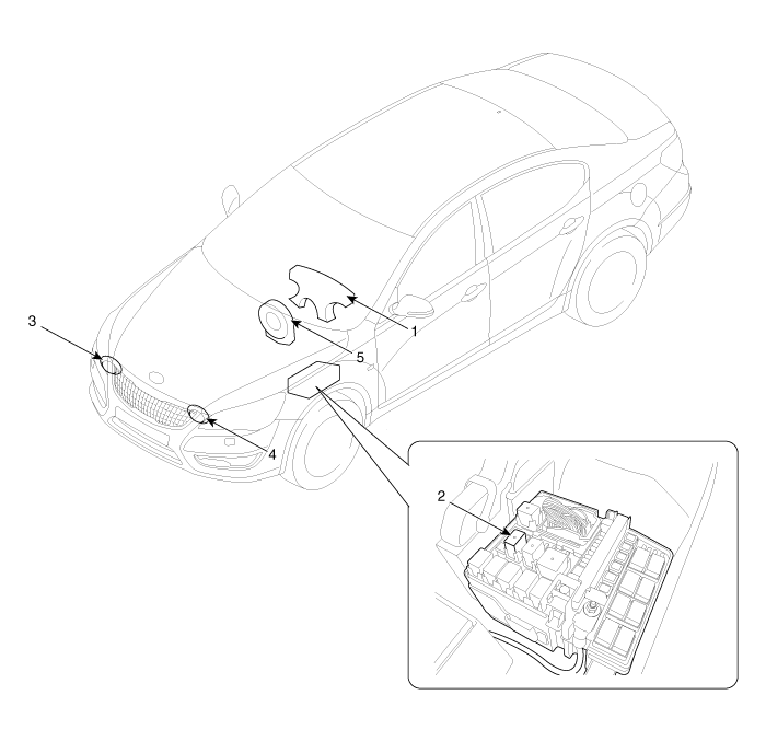 2. Реле звукового сигнала (моторный отсек) 3. Горн — высокий тон |
