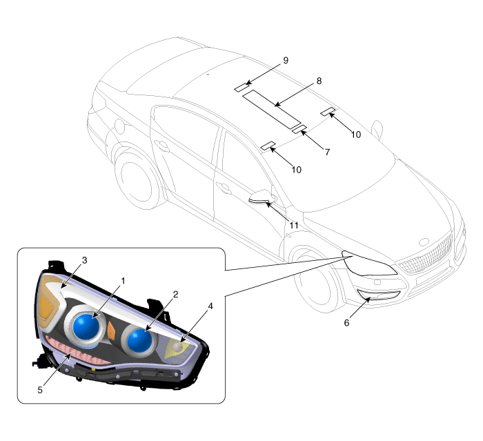 2. Фара головного света (дальний свет) 3. Габаритный фонарь 4. Лампа указателя поворота 5. ДХО 6. Противотуманная фара |