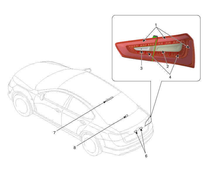 6. Высоко установленный стоп-сигнал 7. Лампа багажника |