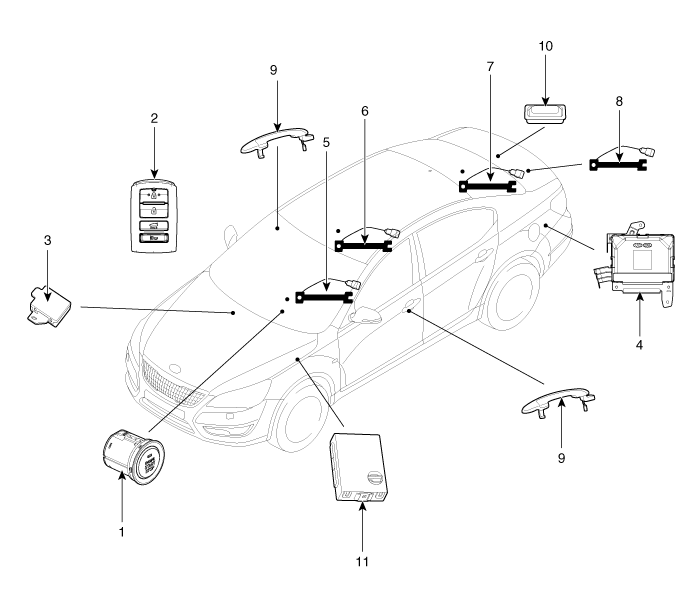 8. Бамперная антенна 9. Дверная ручка и дверная антенна 10. Переключатель открытия крышки багажника 11. IPM (интеллектуальный интегрированный платформенный модуль) |