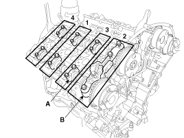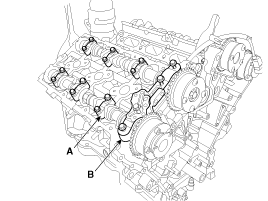 Снимите крышку левого распределительного вала (А) и крышку упорного подшипника (В).