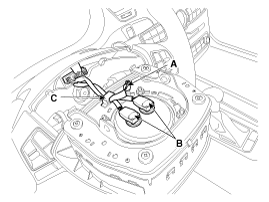 Освободите стопорный штифт разъема, затем отсоедините разъем модуля подушки безопасности водителя (В).
