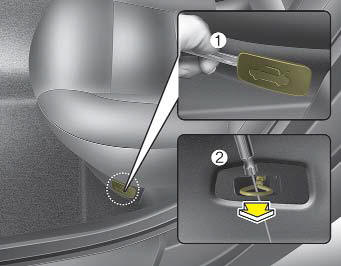 Откройте крышку кабеля (1) под заднее сиденье с механическим ключом и потяните за трос (2) для разблокировки ствол. Кабель надежно закреплен, поэтому может тяжело тянуть. Поэтому, пожалуйста поставить вспомогательное оборудование, такое как отвертку к петле и потяните ее удобно.