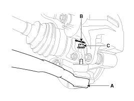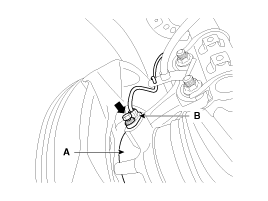 Ослабьте крепежный болт и снимите датчик скорости вращения колеса (В) с поворотного кулака (А).