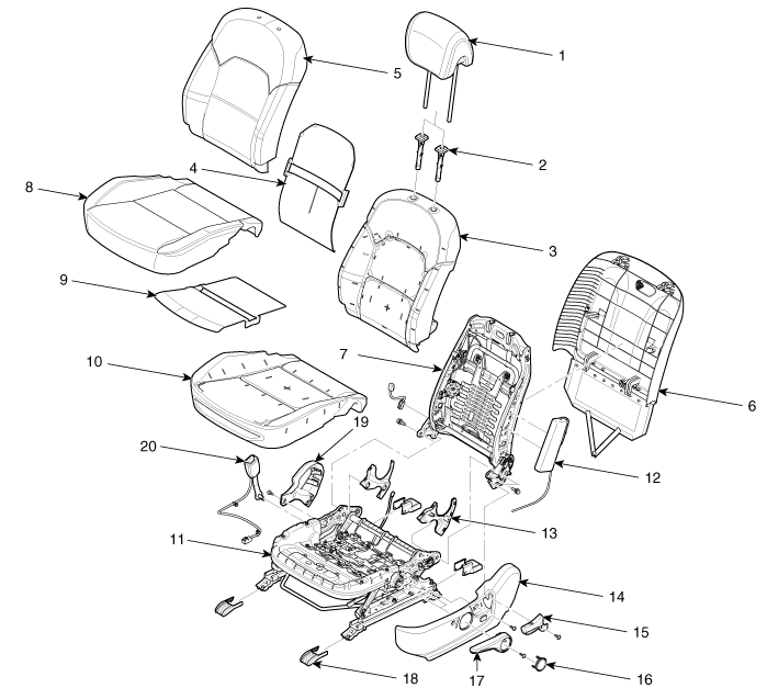 16. Колпачок ручки регулировки высоты переднего сиденья. 17. Ручка регулировки высоты переднего сиденья. 18. Чехол на переднее сиденье 19. Крышка внутреннего щитка переднего сиденья 20. Пряжка переднего сиденья |