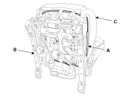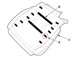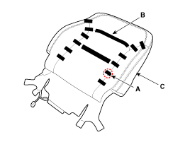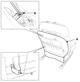 Сняв зажимы для свиного кольца) и застежку-липучку (B) на передней части спинки сиденья, снимите обивку спинки сиденья (C).