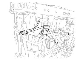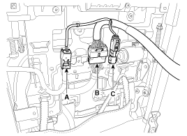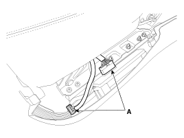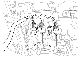Отсоедините разъем замка сиденья (A), разъем обогревателя сиденья и разъем сиденья с электроприводом (B), разъем SAB (C), разъем PODS (D).