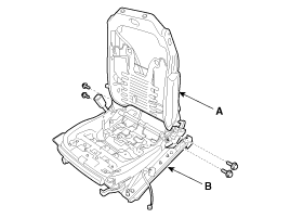 Ослабив крепежные болты, отсоедините раму спинки сиденья (А) и раму подушки сиденья (В).