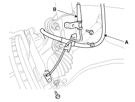 Снимите тормозной шланг (А) и кронштейн датчика скорости вращения колеса (В) с передней стойки в сборе, ослабив крепежные болты.
