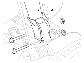Отсоедините узел передней стойки (А) с поворотным кулаком, ослабив болт и гайку.