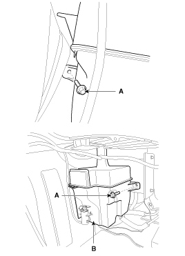 Снимите бачок омывателя (В), открутив 2 болта (А).