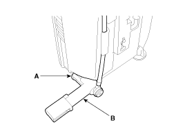 Снимите фиксирующий зажим трубки амортизатора (A), а затем отделите головку в сборе (B) от чашки резервуара.