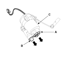 Отделите электродвигатель насоса (А) и регулятор (В) от топливного фильтра (С).