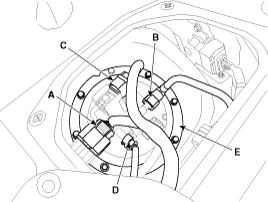 Отсоедините модуль управления топливным насосом и удлинительный разъем топливного насоса (А).