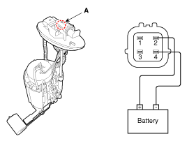 Убедитесь, что двигатель работает должным образом при подаче напряжения аккумуляторной батареи на клеммы 2 и 4 разъема топливного насоса (А).