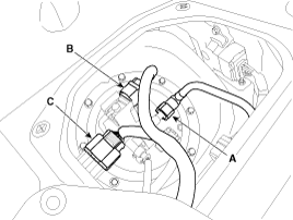 Отсоедините модуль управления топливным насосом и удлинительный разъем топливного насоса (С).