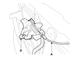 Отсоедините трос замка капота (А) и снимите замок капота (В).