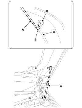 Отрегулируйте высоту капота, повернув амортизаторы капота (C).