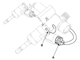 Снимите соединитель (А) и фиксирующую скобу (В), а затем отделите инжектор от напорной трубы.