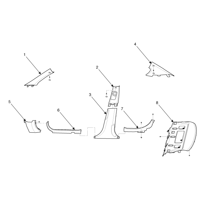 2. Верхняя обшивка центральной стойки 3. Нижняя обшивка центральной стойки 4. Облицовка задней стойки |