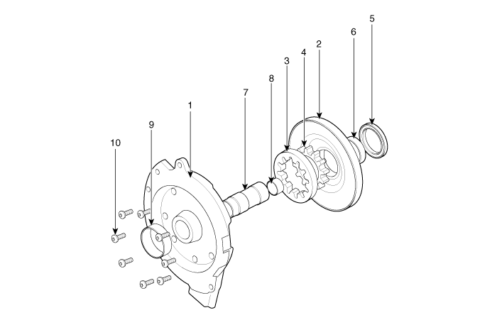 2. Корпус масляного насоса 3. Ведомая шестерня 4. Привод 5. Сальник |