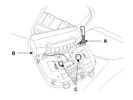 Снимите лампу потолочной консоли (B), отсоединив разъем выключателя панорамной крыши и разъем лампы (A).