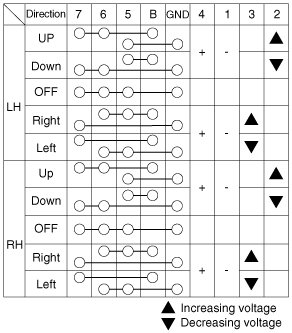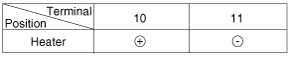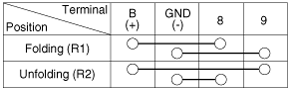 Подайте напряжение батареи на каждую клемму, как показано в таблице, и убедитесь, что зеркало работает правильно.