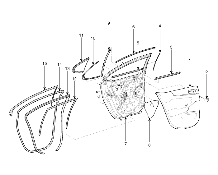 10. Задний молдинг рамки задней двери 11. Неподвижный стеклянный уплотнитель задней двери. 12. Стеклоподъемник задней двери 13. Боковой уплотнитель кузова задней двери 14. Боковой уплотнитель задней двери 15. Верхний уплотнитель задней двери |