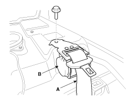 Ослабив болты крепления натяжителя (В), снимите задний ремень безопасности (А).