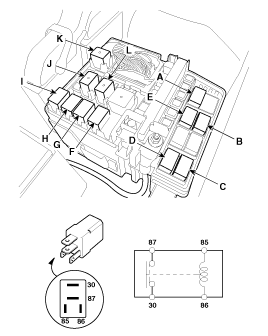 H. Пусковое реле I. Обогрев заднего стекла Эстафета Дж. Хорн K. Реле АСС L. Реле топливного насоса |