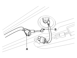 Измерьте напряжение между клеммой 2 питающего кабеля со стороны жгута проводов (А) и массой кузова (В).