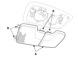 Снимите комнатный светильник в сборе (А) с облицовки потолка, отсоединив разъем (В).