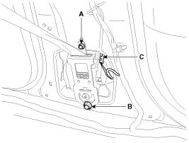 Подсоедините разъем преднатяжителя ремня безопасности (BPT) (C).